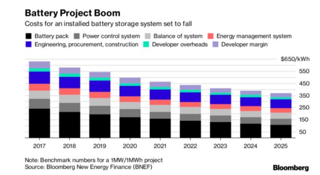 Bloomberg New Energy Finance says that costs for battery storage at the grid level are plummeting and will continue to drop until at least 2015.