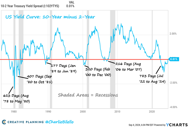 The current inversion is still at 1 percent, so for a de-inversion signal we need at least two 50 basis points cuts, or several 25 bps cuts. This could take us into 2025.