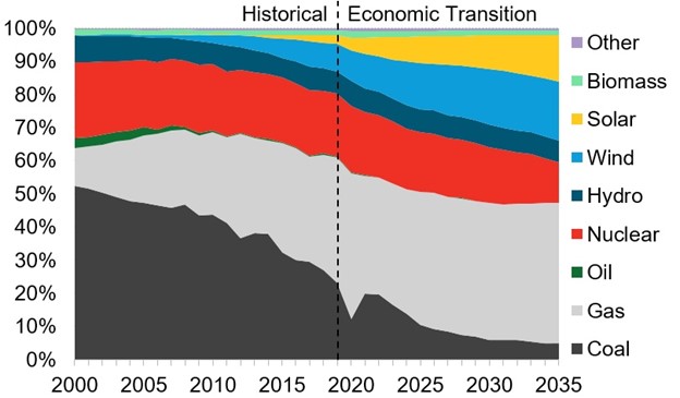 Gas and coal make up 65 percent currently and, without policy intervention, are forecast to drop to 55 percent by 2030. Most of that decline comes from eliminating coal-fired plants (black shaded area). Wind and solar shares increase, while hydro and nuclear remain about the same.