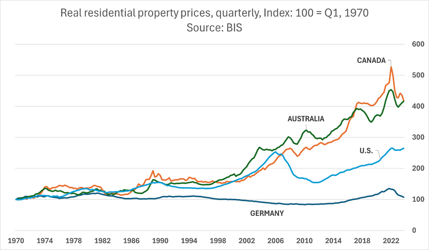 This chart shows prices indexed to 100 in 1970 up to the end of 2023, with data from the Bank for International Settlements (BIS). This index has been deflated by the rate of inflation. The recent drop in the Canadian index happened when inflation soared to 7 percent in 2022 and house prices declined.