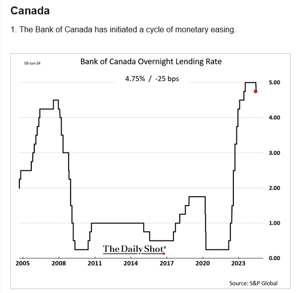 The Bank of Canada cut interest rates by 25 bps on Wednesday and the ECB made a similar cut on Thursday. This marks a significant moment in the history of interest rate policy changes and could be a turning point. CPI Inflation has moderated enough (2.7 percent) to allow cuts without a loss of credibility.