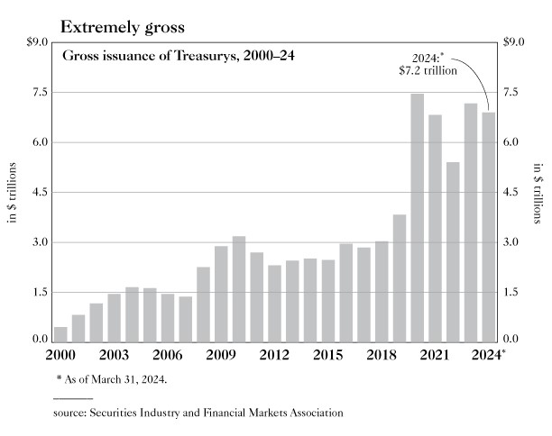 Borrowing by the U.S. Treasury is much larger than the deficit, as the Treasury must roll over maturing Treasuries. So the total issuance is roughly equal to the maturing securities plus the shortfall of government revenue minus expenditures. Maturing securities are about $9 trillion this year and the deficit for 2024 is estimated to be about $2 trillion by the Congressional Budget Office.