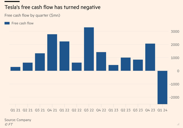 Tesla had been building a large cash balance and reducing its small amount of debt for several years, even as it built new factories and expanded existing facilities. So, it was a shock that free cash flow declined by $2.5 billion for the first time in several years.