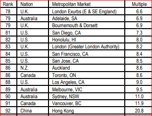Cities in Australia and Canada consistently challenge for the top spot in unaffordability. Five major housing markets in Australia show as “severely unaffordable” with a multiple of greater than 5.0. A multiple of three is considered the upper limit of affordable for detached housing with lower limits for townhomes and apartments, according to Demographia.