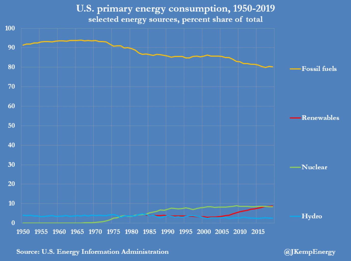 The challenge is enormous as fossil fuels still make up ~80 percent of supply, according to John Kemp: