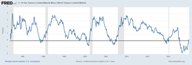 There is another phenomenon that shows up on this chart that many investment people have noticed. Every time the yield curve inversion turns back to a positive number there has been a recession shortly after. And the latest inversion has de-inverted, moving into positive territory in December 2024.