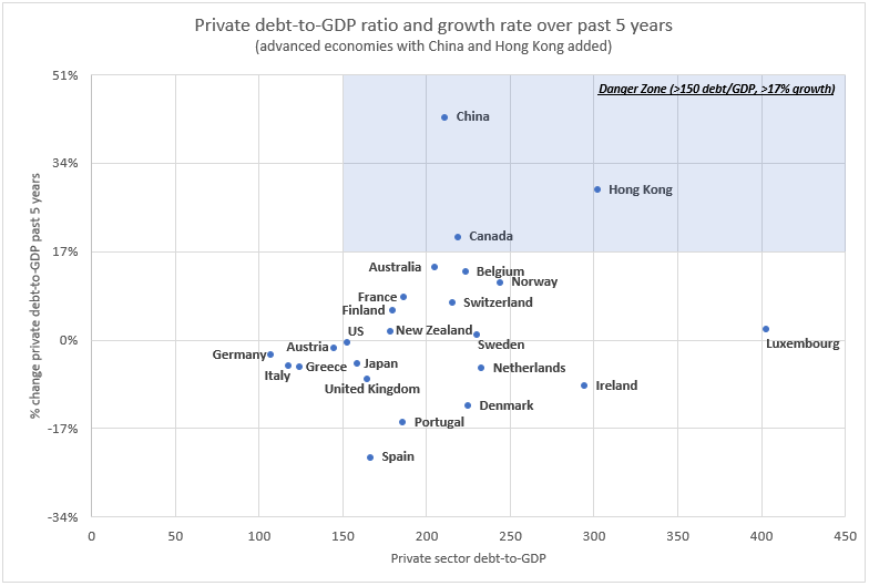 Australia just missed inclusion in the danger zone because corporate sector debt is less elevated than Canada, but household debt is higher than Canada at 120% of GDP versus Canada at about 100%.