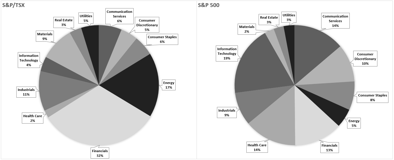 Two sectors, Energy and Financials make up 49% of the S&P/TSX, based on market capitalization. While the top 5 companies in the S&P500 are all in the information technology sector, it is a more diversified index.