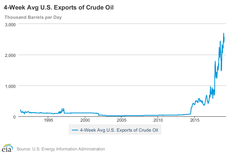 For reference, in 2017, Canada was the largest foreign supplier of crude oil to the U.S. and all 3.3 million barrels that Canada exported that year went to the U.S. As the chart above shows, U.S. exports are getting closer to surpassing Canadian import volumes.