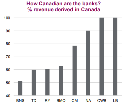 The biggest sector in the S&P/TSX is financials, which includes domestic banks. Every bank in Canada derives most of its revenue from within Canada, the Bank of Nova Scotia having the lowest exposure at 51%.