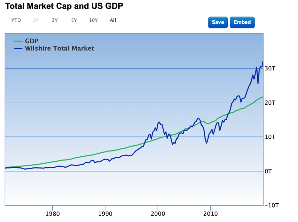 Another way to look at valuation compares stock market valuations to the growth of the economy, measured by GDP.