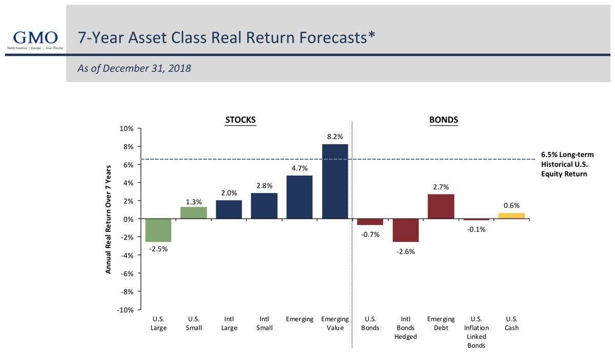GMO LLC (Grantham, Mayo, Van Otterloo & Co. LLC) projects a positive return for emerging market value stocks of more than 8 percent, adjusted for inflation, over the next 7 years, as of the end of December 2018. This is a compound annual return and is higher than the long-term average for U.S. stocks. Here’s GMO’s quarterly letter on emerging markets.