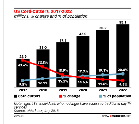 New ways to access to entertainment are disrupting the pay television industry. Cable television “cord cutting” is gaining momentum while online streaming services are exploding in popularity. According to one report there will be 33% more people dropping pay TV services this year than last.