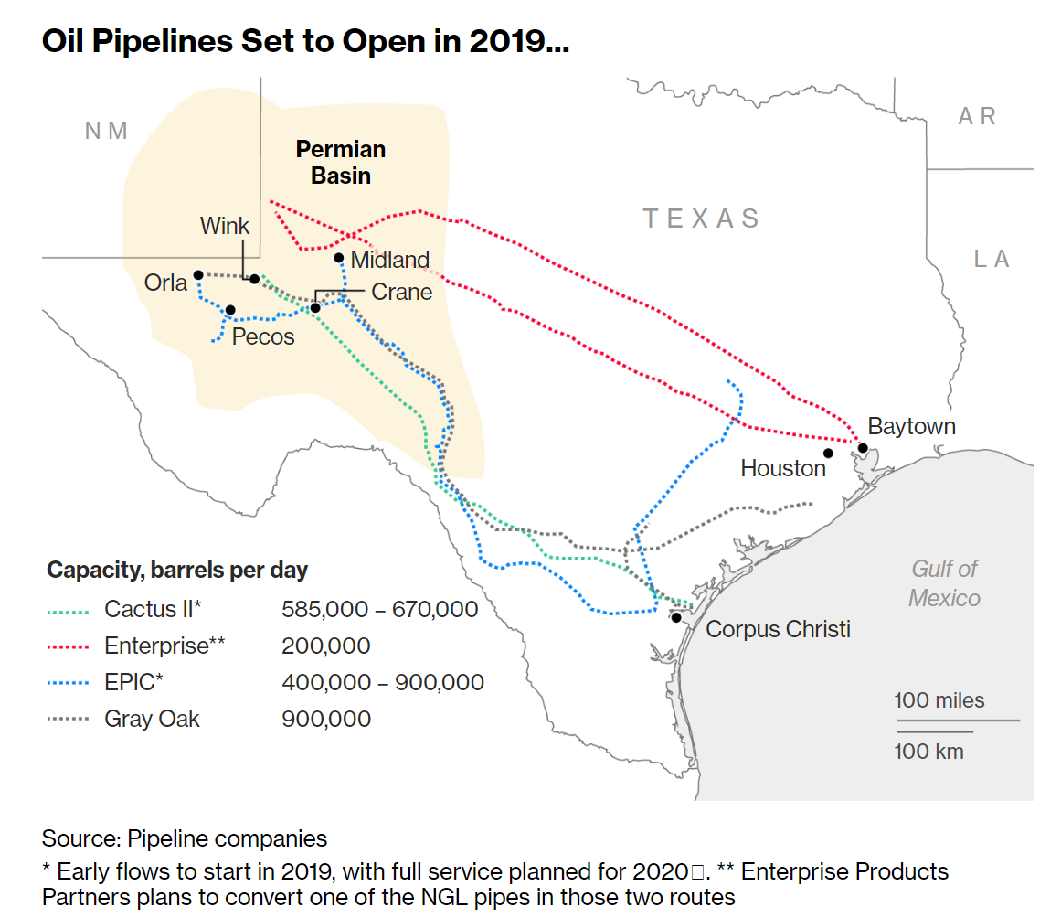 As recently as a few months ago, the consensus opinion was a lack of pipeline capacity from West Texas to the Gulf Coast would put a halt to production increases. But it seems that the pipeline constraint affecting the Permian Basin is going to be corrected more quickly than expected. Three pipelines will be open by mid-2019 with more than 2 million barrels per day capacity, and more to come in 2020.
