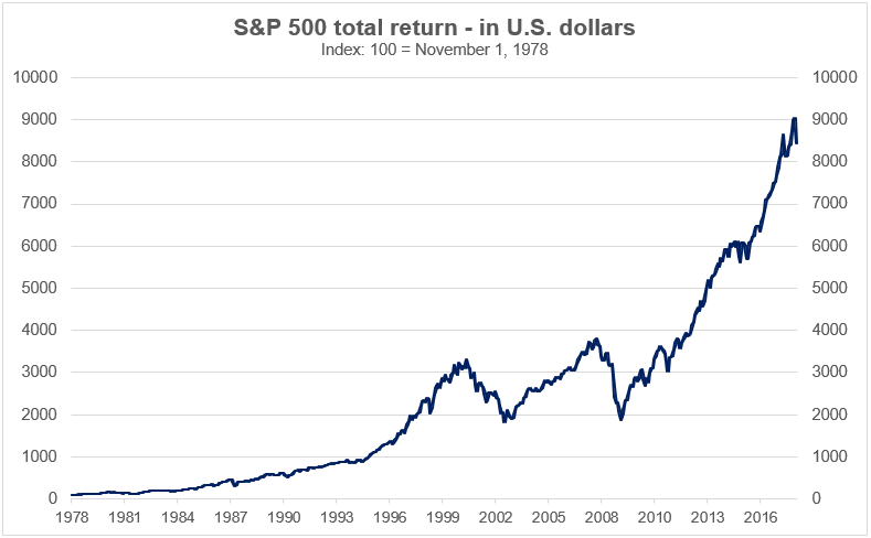 The most important U.S. stock market index, the S&P 500, was quoted at 94 on that day in 1978. Today, after many corrections, a few crashes and many years of growth, the S&P 500 trades 28 times higher. And that doesn’t include dividends of about 3%. Counting reinvested dividends, annual returns increase to 11.7%. This amounts to 83 times the original investment!