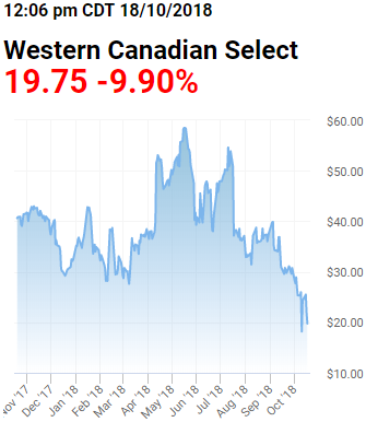 Rising production from oil sands along with a lack of pipeline capacity to move that product to the US market gets the blame for this extremely low price. On October 12, the price for WCS fell to US$15.97, as of yesterday the price has returned to US$19.75.