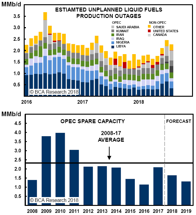In particular, supply issues could appear with Iran’s reaction to sanctions and a lack of spare production capacity in Saudi Arabia. These issues are underappreciated by the market, according to this view. A supply shock could cause a price surge followed by demand destruction (due to high prices) and a U.S. recession in late 2019 or 2020.