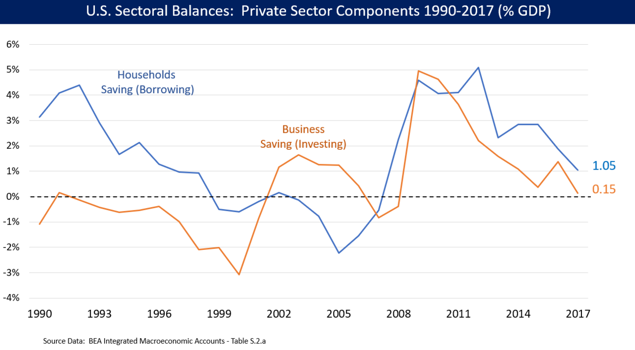 Godley’s chart shows the balance in the business and household sectors. The household sector went heavily into deficit prior to the crisis, as households borrowed aggressively to acquire real estate. It was easy for Godley to see the problem.
