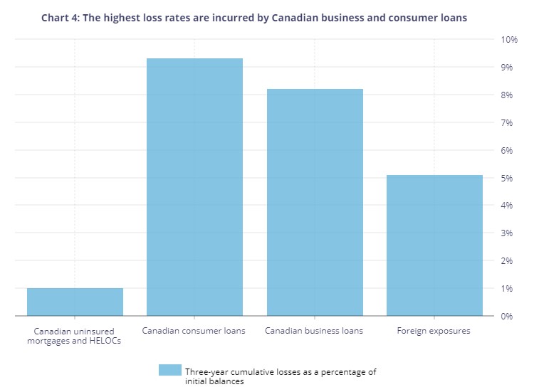 The BOC staff assumes that Canadian banks can enjoy the best of both worlds; operating with high leverage that generates impressive ROE in good times and avoiding major losses on their largest lending product, mortgages, in a severe recession. This scenario seems too rosy.