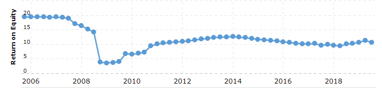 One of the comparable banks in the U.S. is Wells Fargo (WFC), a much larger but similar company, which also concentrates on “retail” lending and mortgages. Here’s a chart of ROE for WFC, from Macrotrends: