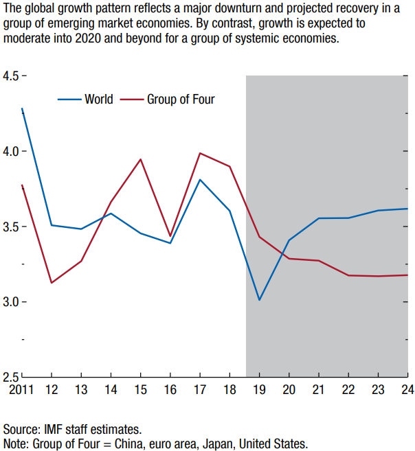 The IMF singles out the slowdown in manufacturing activity to explain their downgrading of economic activity. Rising global trade tensions and geopolitical concerns also contribute to the weakness.