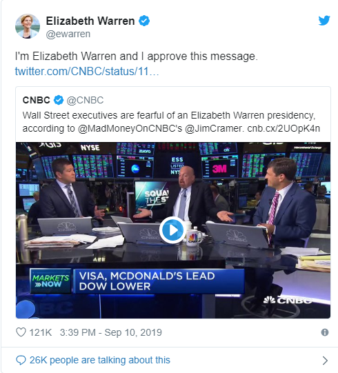 On September 10, 2019 Jim Cramer of Mad Money on CNBC suggested that Wall Street executives are “fearful of an Elizabeth Warren presidency.” Cramer discusses Warren in a 2:54 clip.