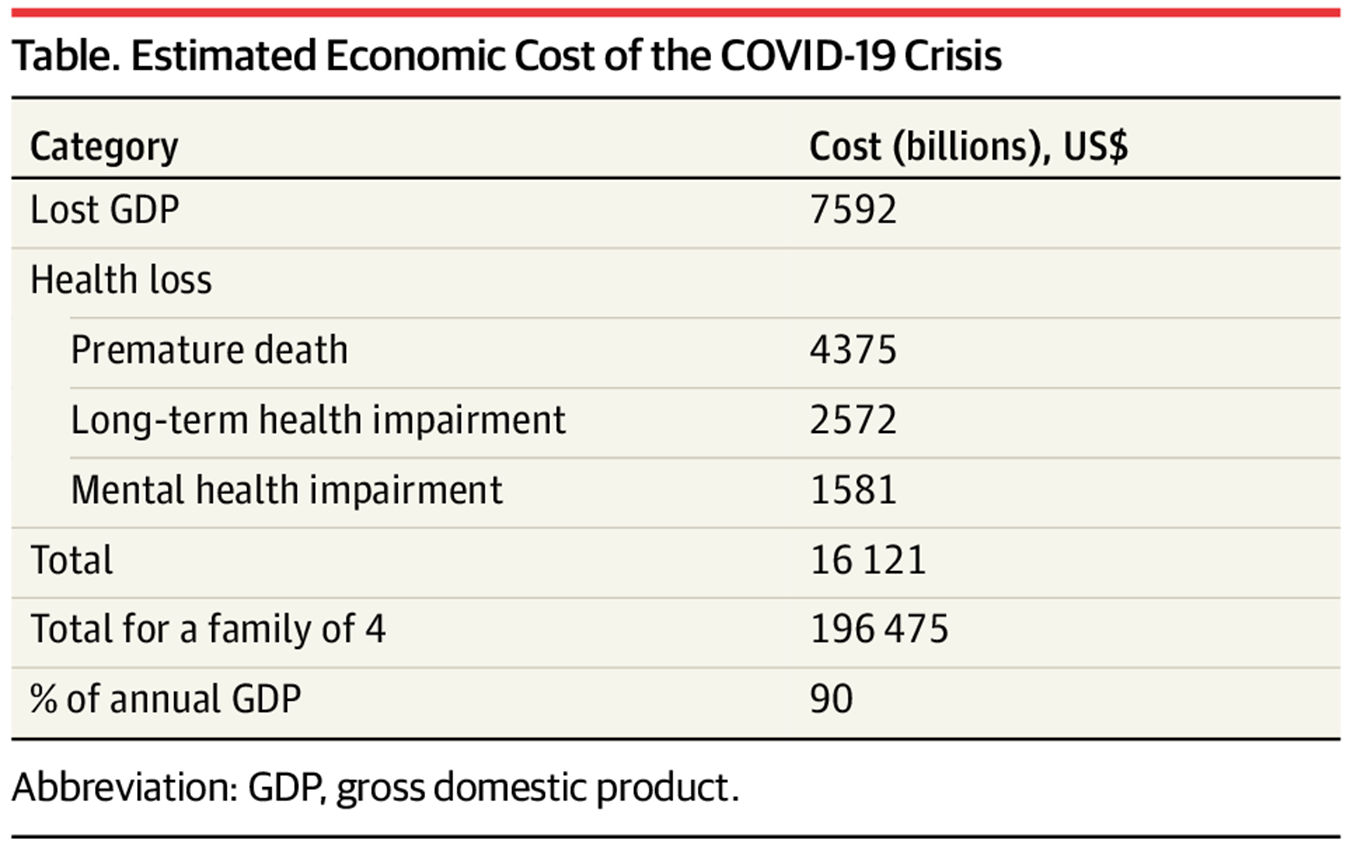 In the US, the cost of the recession created by restrictions to fight the pandemic have been estimated by David Cutler and Lawrence Summers in JAMA October 12, 2020 to be about 90 percent of GDP, or about $200,000 per US family.