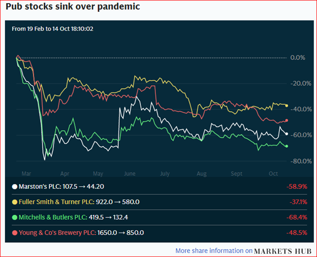In London the cries of pain are loud as Tier 2 measures are expected to be imposed this week. No indoor crowds will be allowed, which means restaurants and pubs will be hit hard now that patios will be closed. There are several publicly traded pub chains, and their shares were down from 37 percent to 68 percent from the onset of COVID in February.