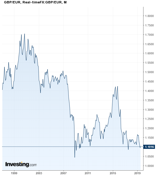 The Pound sterling (GBP) is close to a 20-year low against the Euro (EUR). On Thursday GBPEUR traded at about 1.10, higher than the July low 1.07. Look for Sterling to break through the 1.00 level against the Euro if there’s an election called or if there’s a no-deal Brexit.