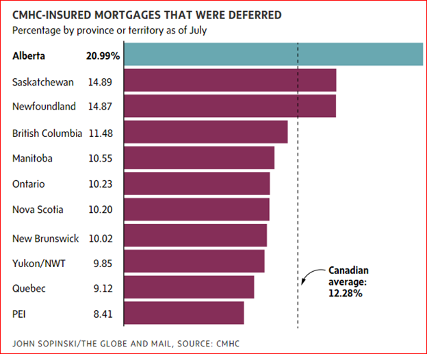 Alberta could be the epicentre of this next phase of the recession as deferrals and debts there are much larger in both volume and dollars than the Canadian average. Note that the top three provinces in deferrals are dependent on resource income.