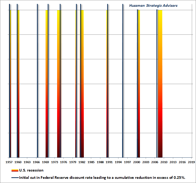 Most traders love rate reductions, as they think markets will move higher and they don’t understand that lower rates can be a sign that the economy is in recession, or soon will be. As John P. Hussman of Hussman Strategic Advisors points out, in the last sixty years, the Fed has cut rates 11 times, but only twice, in 1967 and 1996, have those cuts not signaled the start of a recession.
