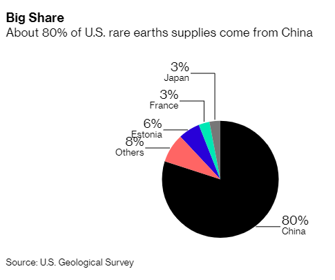 The specific threat this time refers to “rare earth elements”, a group of 17 elements that have many uses in manufacturing and electronics. China accounts for 70 percent of the world’s production of these elements, which despite the name are not particularly rare. Canada for example has significant deposits but most countries, including the U.S., rely on China to supply them. An article at Bloomberg.com “China gears up to weaponize rare earths in trade war” has more information.