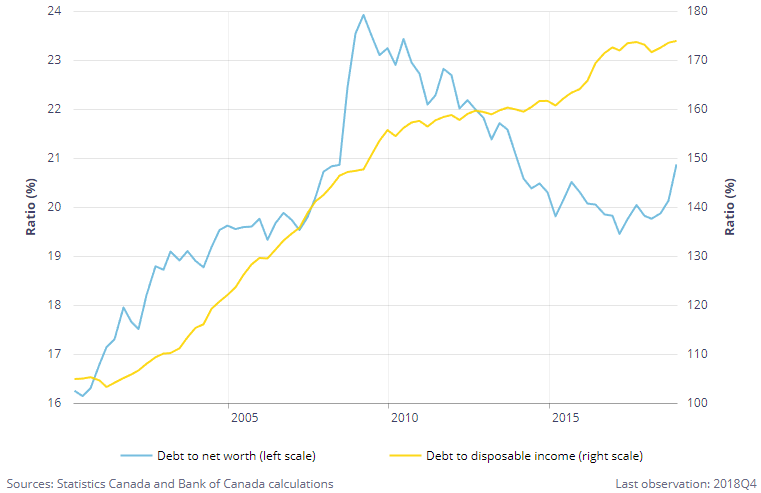 The ratio of debt to disposable income is stable, while debt to net worth has increased recently