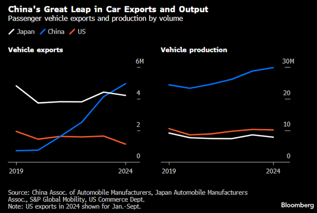 China’s total production will reach 30 million vehicles this year, with about 5 million exported. About 50 percent of the value of these exports is electric.