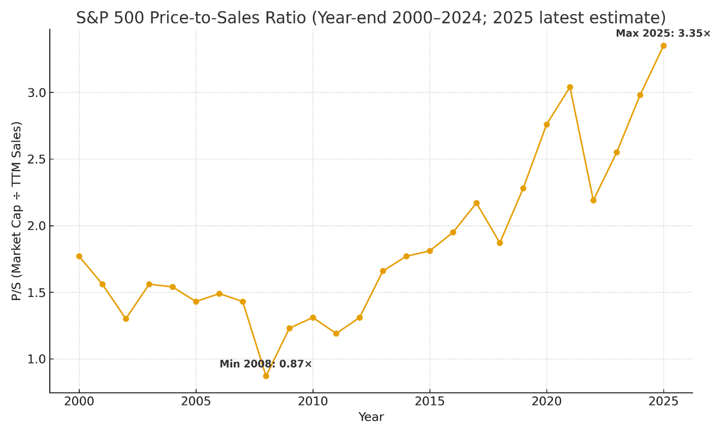 The problem? Valuations have run far ahead of sales. The Mag 7 trade at 9.4× sales, compared with a long-term S&P 500 average of 1.8×. The S&P 500 trades at 3.35x today. In the last crash (2008), the ratio fell to under 1.0.