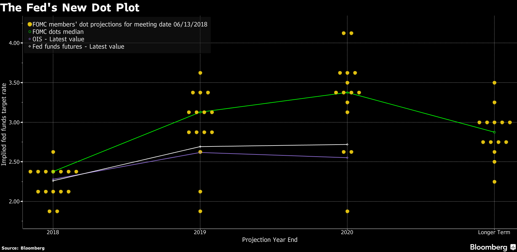 At the current pace the Fed Funds rate would reach about 3.50 percent by 2020, according to the Fed’s “dot plot”: