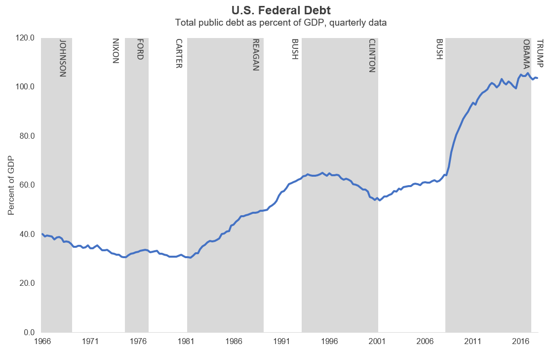 President Reagan tried something similar in the 1980s and was forced to reverse course by RAISING taxes a few years later, as the budget deficit soared. Here we see that the U.S. Debt/GDP from 1980 to 1990 increased by 50%, most of which occurred during Reagan’s eight years.