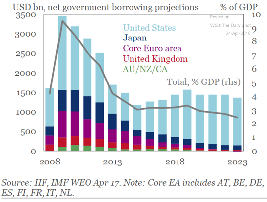 The projections for future government deficits are shocking. Here’s a chart comparing the US to other jurisdictions, showing ever-increasing borrowing requirements for years: