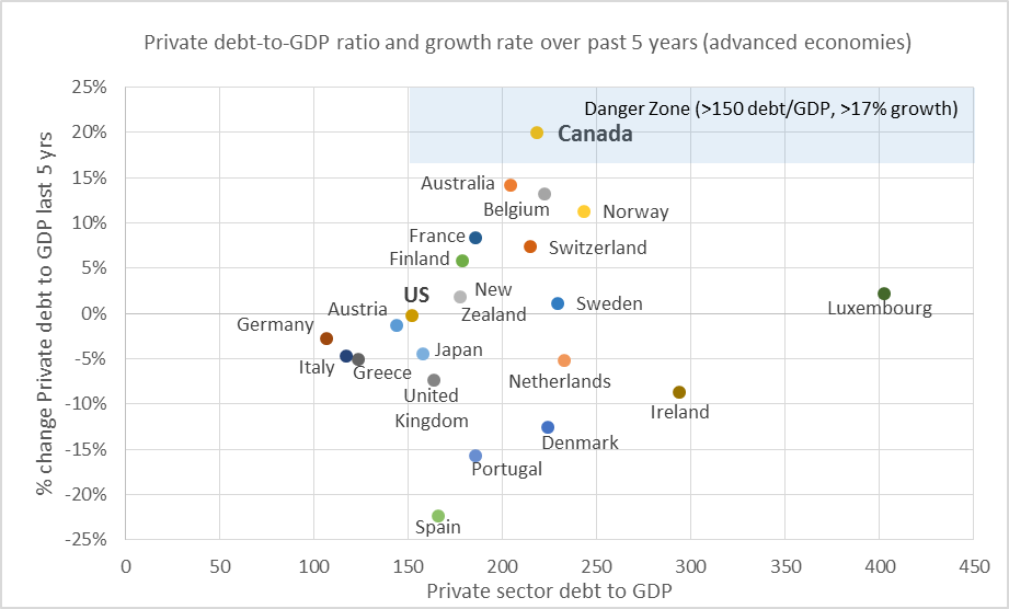 Canada’s private sector debt is in the danger zone. This is measured by the level of debt compared to GDP, with Canada at 233% of GDP compared to the threshold of 150% to reach the danger zone. And there’s been a rapid increase in the ratio of debt to GDP of greater than 17% over a five-year period.