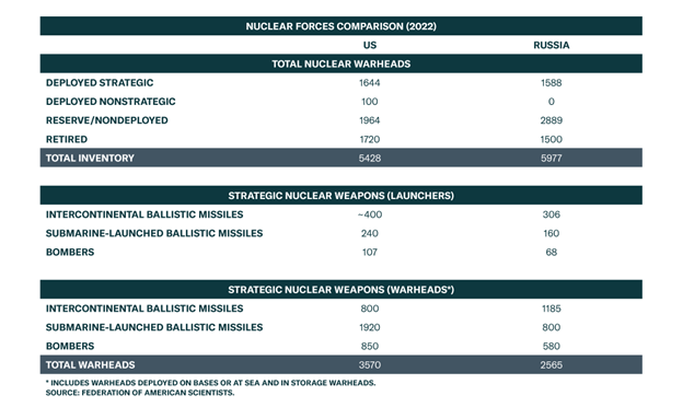 While the US has an advantage in some parts of the supplies, Russia has a slight edge in number of warheads. Either country could easily destroy large cities and kill millions of people.