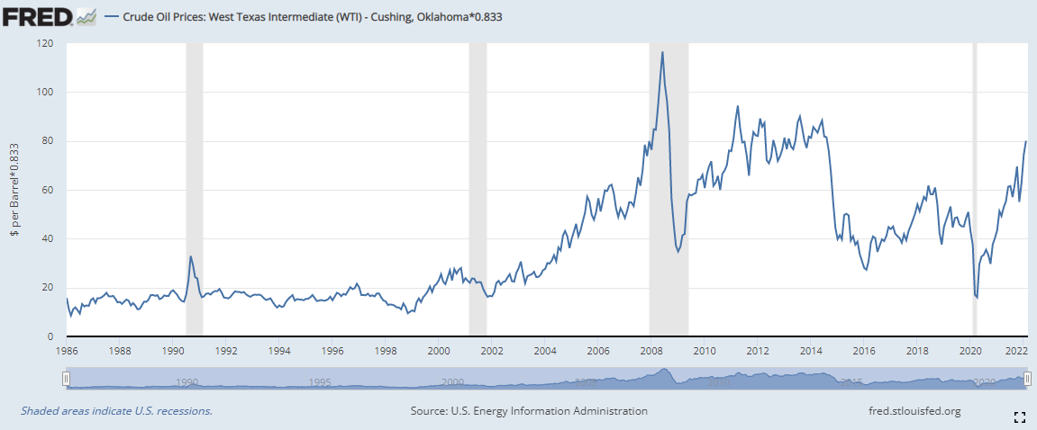 Credit Suisse charts published on February 14, 2022, show oil at $80 while it is now $120 – deflated using today’s prices. That same methodology is used here in a chart from FRED/St. Louis Fed: