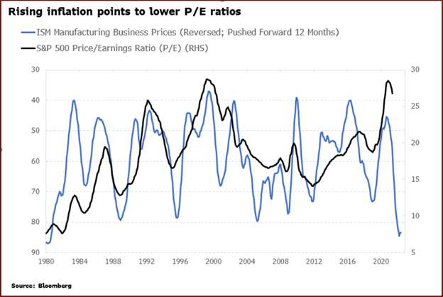 The Markets Live segment of Bloomberg published a chart a few days ago that caught my eye. The chart shows the relationship between Manufacturing Business Prices Paid and the S&P 500 Price Earnings ratio. Prices Paid is not a component of CPI but is a survey that has been reliable as a predictor of future inflation.