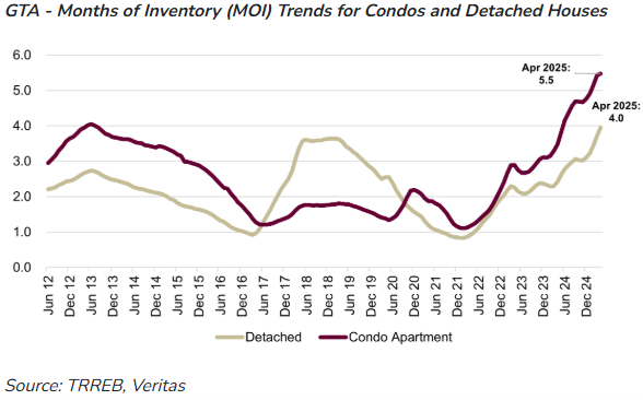 On these charts we see that months of inventory of condos and homes in the GTA are at the highest levels in at least thirteen years.