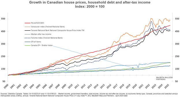Our team has been tracking prices for Toronto, Vancouver and Canada for many years. To the data from Teranet-National Bank for house prices we added the key variables of household debt, CPI inflation, shelter inflation and median after-tax income. All series are based to 100 in the year 2000.