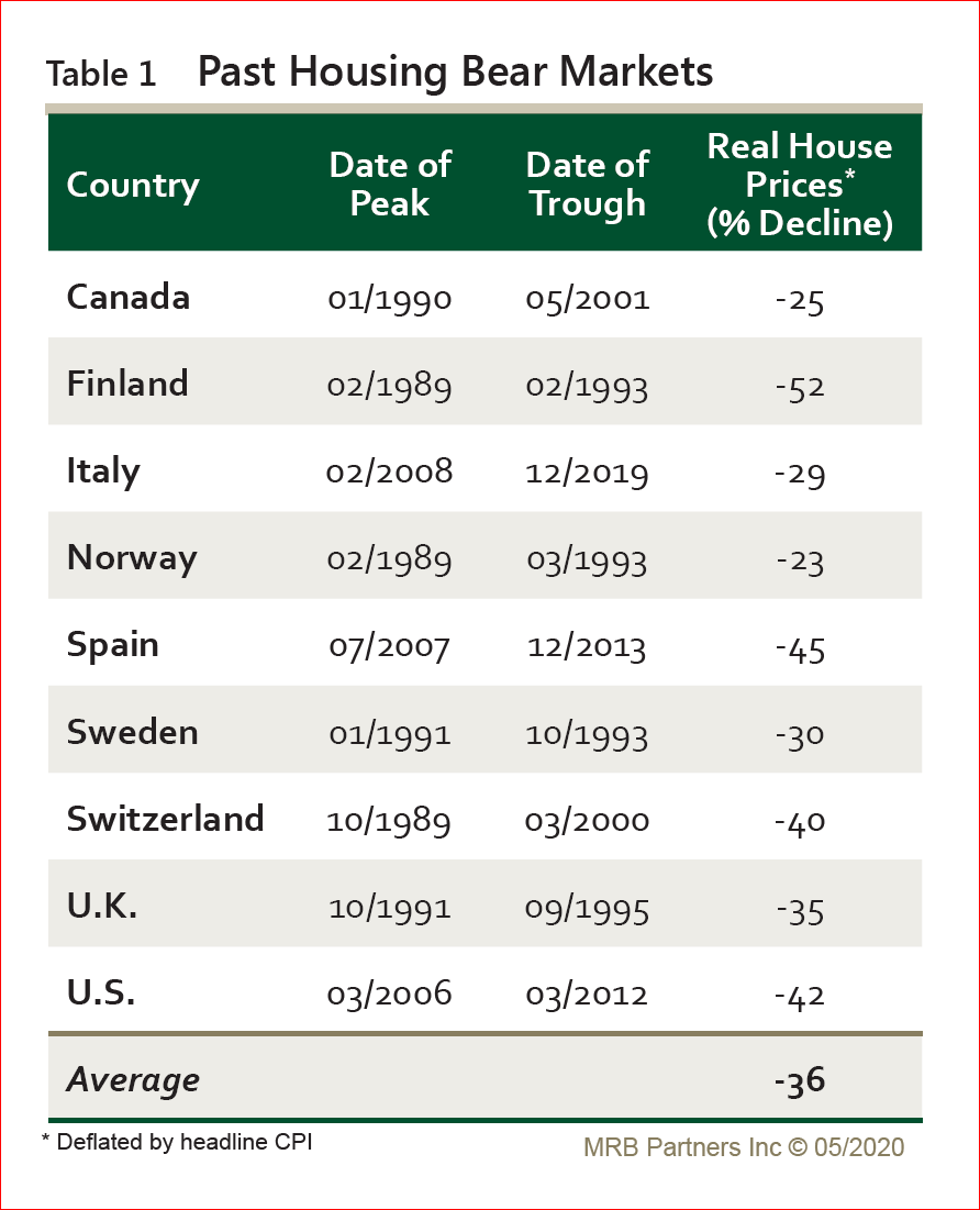 A large correction in house prices is forecast by many non-bank analysts. Even the CMHC forecasts average price declines of 9 to 18 percent. Other macroeconomic researchers expect price declines of 30 to 40 percent, in line with past crashes in Canada and other countries. According to MRB Partners the average decline in housing bear markets is 36 percent: