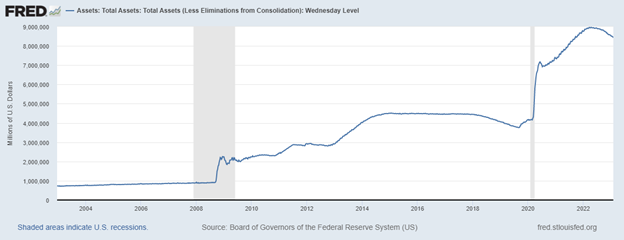 Prior to 2009 the Fed balance sheet, its holdings of government bonds, mortgage-backed securities (MBS) and other liquid securities such as T-bills, was about $1 trillion. Today it is close to $8.5 trillion and is within a trillion of its all-time high in 2022.