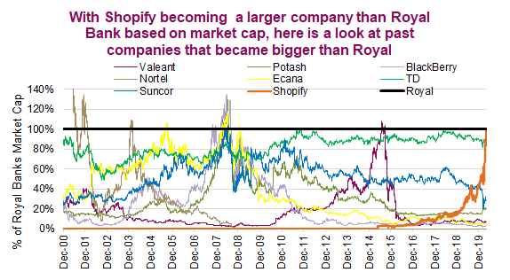 Shopify, like Amazon, has risen to a prominent position in the stock market. At March 31, 2020 SHOP occupied the sixth spot in value in the Canadian S&P/TSX Composite Index. Now, five weeks later, the total market value of SHOP is $85 billion and briefly passed the leader, The Royal Bank of Canada. Most of the companies that have outdone Royal Bank’s value such as Nortel (bankrupt), Valeant (Bausch Health), Encana (Ovintiv) and Research in Motion (Blackberry) are infamous for their “flash in the pan” status.
