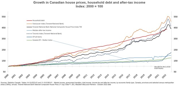 The Teranet-National Bank house price index was at approximately 227 in 2019 and in May 2022 it hit 327, for a gain of about 44 percent.