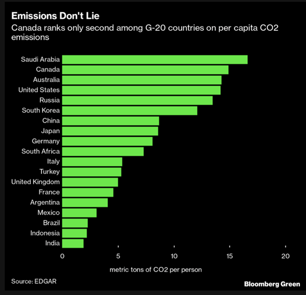 Canada is second only to Saudi Arabia in emissions of metric tons of CO2 per person, due to Canada’s status as a major producer of oil and gas. Other countries, like the Saudis, Russia and Australia, are there for similar reasons. The US, besides being the world’s largest producer of crude oil, is a major user of gasoline and diesel to run cars and light trucks, burning about 9 million barrels per day, about 9 percent of total world demand for crude oil!