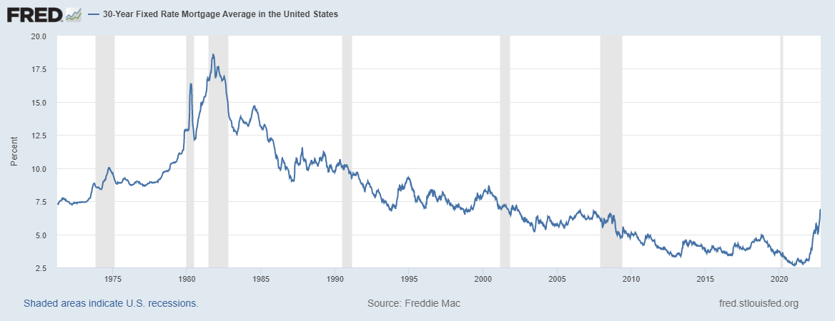 This protest has erupted long before interest rates have reached penal levels. Here is the history of mortgage rates, using US data: